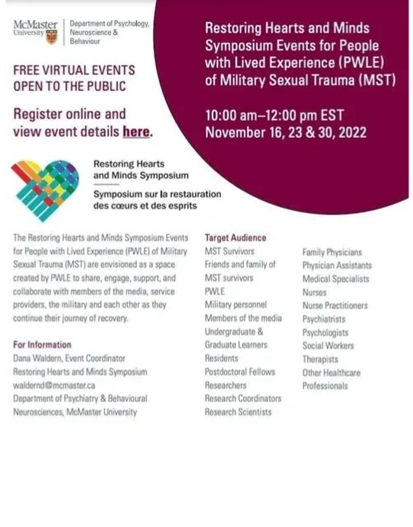 The Canadian Military Sexual Trauma Community of Practice, McMaster University’s Department of Psychiatry and Behavioural Neurosciences, and the Centre of Excellence - PTSD (now known as Atlas Institute) hosted a three-part virtual symposium on Military Sexual Trauma.